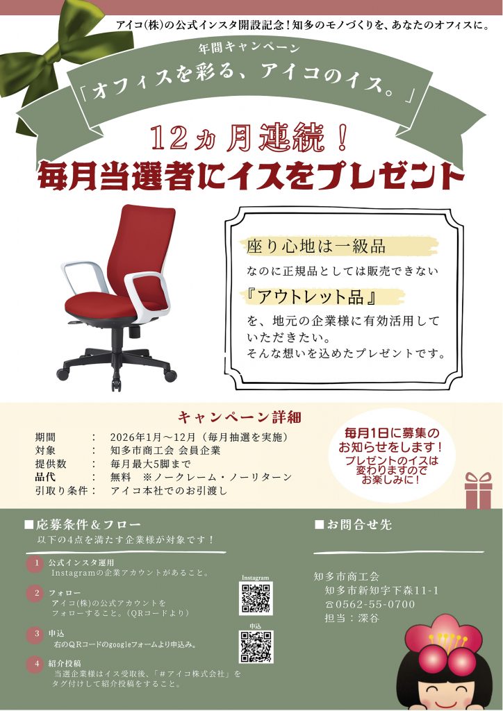 知多市商工会では、会員企業であるオフィス家具メーカー「アイコ株式会社」様(知多市)と連携し、地元のモノづくりを身近に感じていただくためのプレゼント企画を実施いたします。