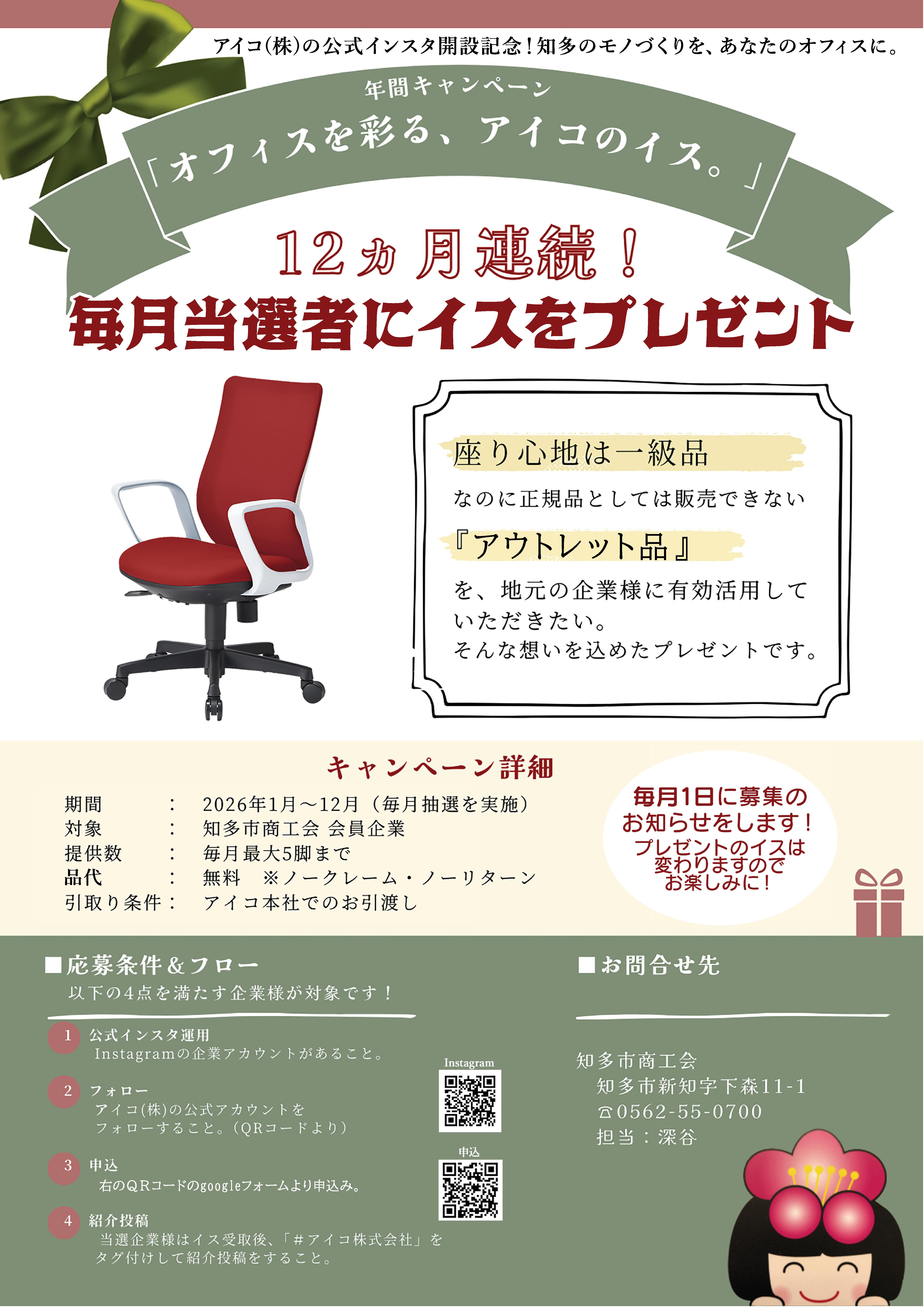 アイコ様ではこの度、公式Instagram( @aico_chair )を開設されました。これを記念し、「座り心地は一級品ながら、展示品等の理由でアウトレットとなったイスを地元の企業様に有効活用していただきたい」との想いから、年間を通じて毎月1社様に自社製品のイスを寄贈されます。